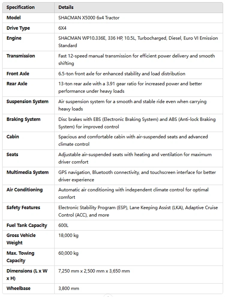 With its 600L fuel tank and an impressive towing capacity of 60,000 kg, the SHACMAN X5000 6x4 Tractor stands out as a versatile and high-performing solution for businesses. It offers an unbeatable combination of power, safety, and driver comfort, making it the perfect choice for challenging transportation operations.