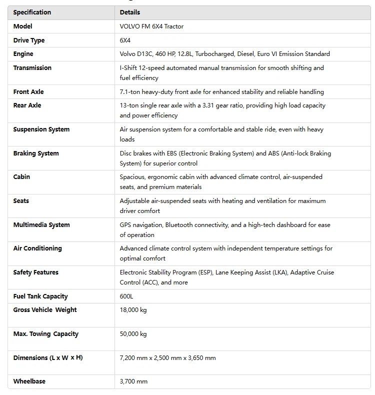 The VOLVO FM 6X4 Tractor stands out as a versatile, cost-effective solution for businesses seeking reliability, performance, and efficiency. Whether for freight, construction, or logistics, this heavy-duty truck is designed to meet the rigorous demands of modern transport operations.
