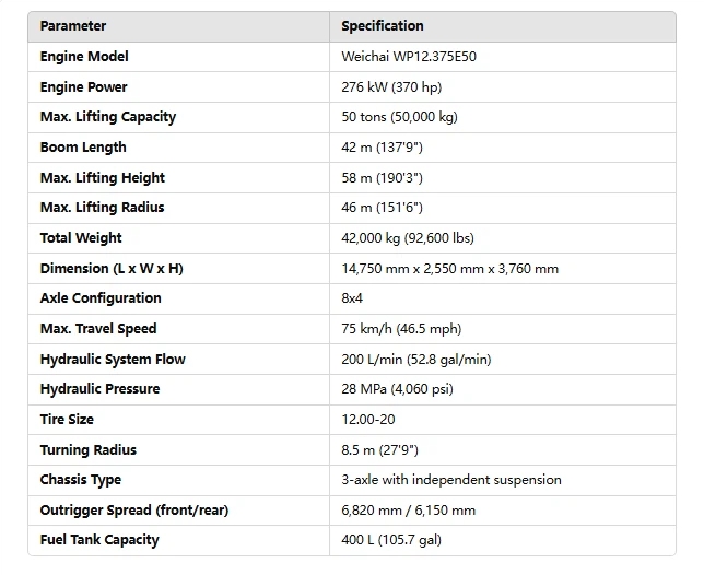This truck crane is equipped with a telescopic boom system, extending up to 42 m (137.8 ft) with the main boom and 49.8 m (163.4 ft) when the jib is deployed. Its multi-section design allows flexibility and precision in lifting operations, whether working on confined urban projects or expansive construction sites. The boom's advanced hydraulic system ensures smooth extension and retraction, contributing to the crane's overall efficiency.