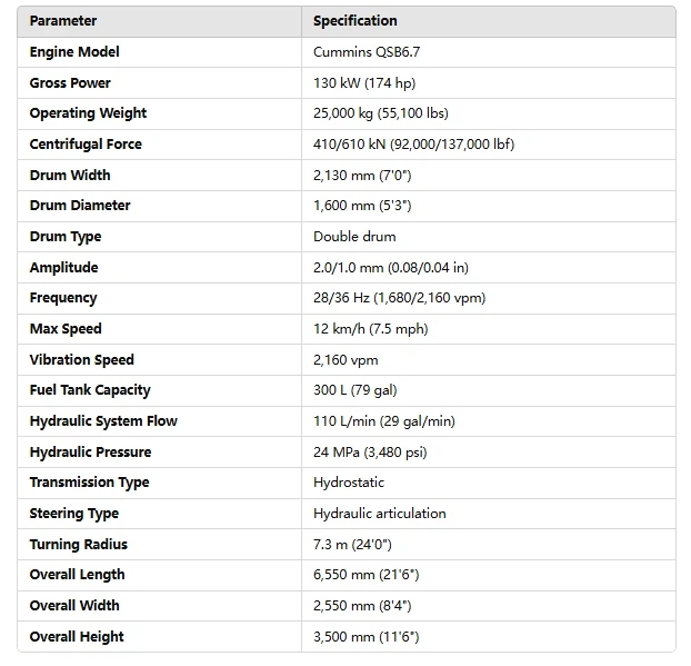Equipped with double drums, the Dynapac CA25 Roller features a drum width of 2,130 mm (7'0") and a drum diameter of 1,600 mm (5'3"), providing ample surface coverage and optimal compaction. It delivers centrifugal forces of 410/610 kN (92,000/137,000 lbf), with an amplitude of 2.0/1.0 mm (0.08/0.04 in), ensuring efficient compaction for a variety of materials. The roller operates at frequencies of 28/36 Hz (1,680/2,160 vpm), offering consistent and smooth compaction results.