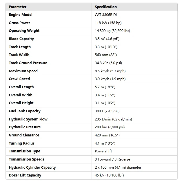 With a hydraulic system flow rate of 235 L/min (62 gal/min) and an operating pressure of 200 bar (2,900 psi), the bulldozer ensures smooth and powerful blade operation. A fuel tank capacity of 300 L (79.3 gal) supports extended working hours with minimal downtime. Designed for reliability and versatility, the CAT D6D Bulldozer is the perfect solution for contractors seeking efficiency and robust performance on demanding earthmoving tasks.