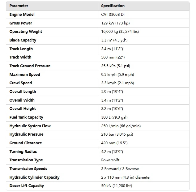 Equipped with a 3.3 m³ (4.3 yd³) blade capacity, this bulldozer is perfect for grading, pushing, and clearing operations, handling large material volumes with ease. The CAT D6G Bulldozer offers a maximum speed of 9.5 km/h (5.9 mph) and a crawl speed of 3.3 km/h (2.1 mph), providing efficient performance and precise control in tight spaces or challenging conditions.