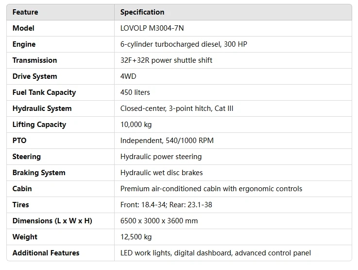 The LOVOLP M3004-7N agricultural tractor is a powerhouse designed to tackle the most demanding tasks in modern farming. With a 300 HP 6-cylinder turbocharged diesel engine, it delivers exceptional torque and performance, making it an ideal choice for heavy-duty applications. Its 4WD system ensures superior traction and stability on challenging terrains, while the 32F+32R power shuttle transmission provides smooth and precise operation, maximizing productivity in the field.