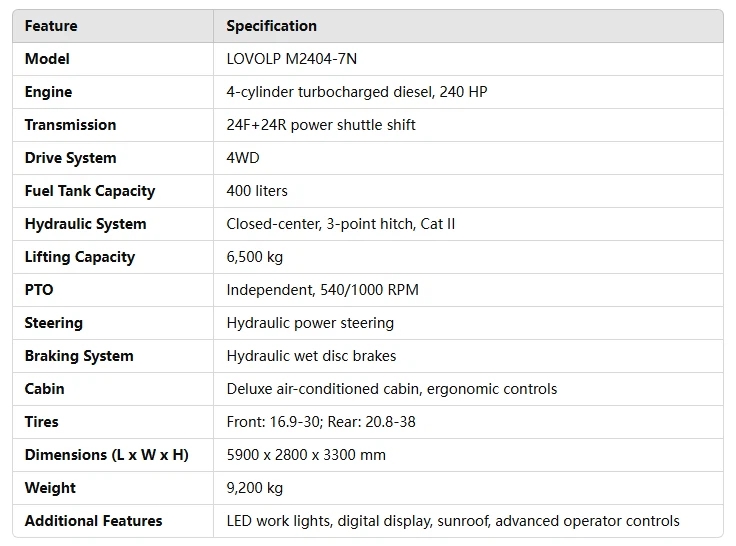The LOVOLP M2404-7N agricultural tractor is a high-performance machine designed to meet the rigorous demands of large-scale farming. Equipped with a powerful 240 HP 4-cylinder turbocharged diesel engine and a robust 4WD system, it delivers the strength and reliability required for heavy-duty fieldwork across challenging terrains.