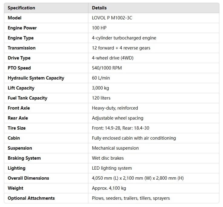 The LOVOL P M1002-3C agricultural tractor is a high-performance, versatile machine designed to meet the demands of modern farming. Equipped with a powerful 100 HP turbocharged engine, this tractor delivers reliable performance for a range of field operations, such as plowing, seeding, and hauling. Its 4WD system ensures excellent traction, even on challenging, uneven terrains, making it suitable for all types of farming environments.