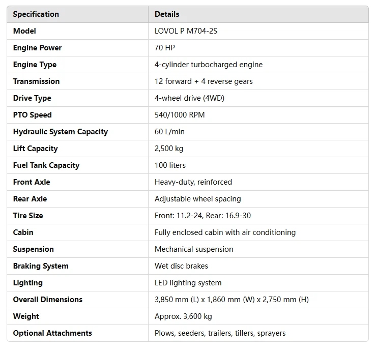 The LOVOL P M704-2S agricultural tractor is a powerful and reliable machine designed to handle a wide range of agricultural tasks. Powered by a 70 HP turbocharged engine, this tractor provides exceptional performance in fieldwork such as plowing and seeding. Its 4-wheel drive (4WD) system ensures maximum traction and stability, making it ideal for working in hilly or muddy terrains.