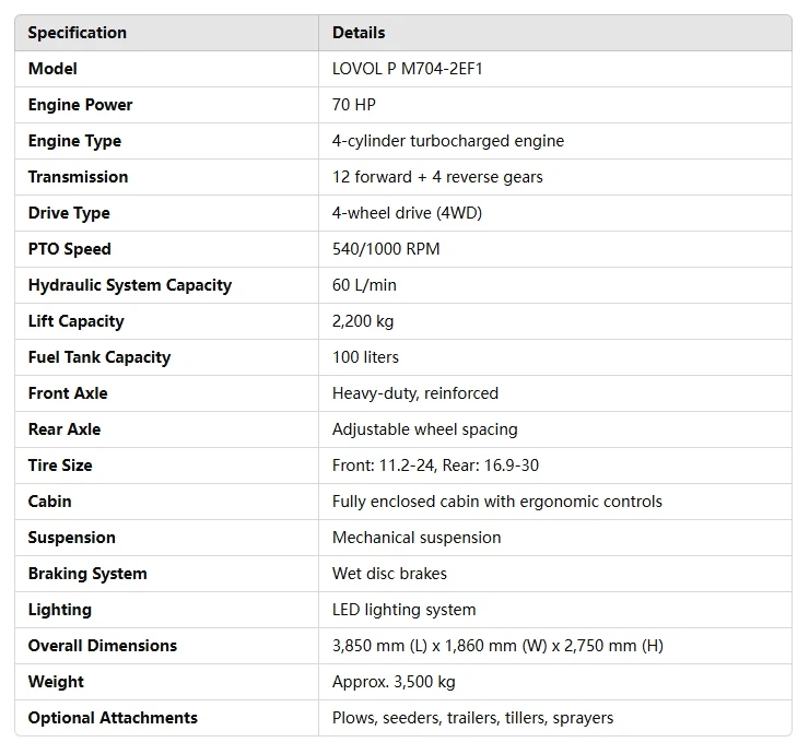 The LOVOL P M704-2EF1 agricultural tractor is a high-performance machine designed to meet the demanding needs of modern farming. Powered by a robust 70 HP turbocharged engine, this tractor provides exceptional power for a wide range of agricultural tasks. Its 4-wheel drive (4WD) system ensures excellent traction and stability, making it suitable for use on uneven or hilly terrains.