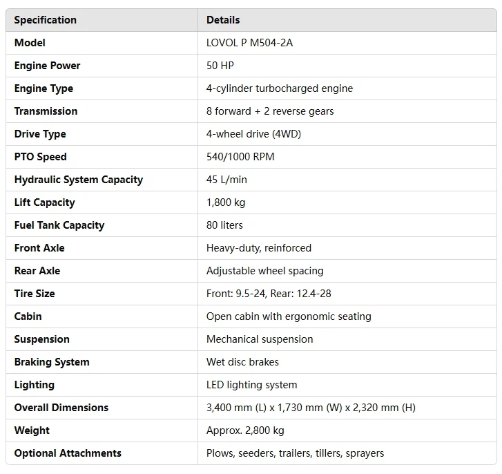 The LOVOL P M504-2A Agricultural Tractor is the ideal solution for small and medium-sized farms looking for a reliable, high-performance machine. Powered by a 50 HP turbocharged engine, this tractor delivers superior power and efficiency, ensuring exceptional productivity in various farming tasks.