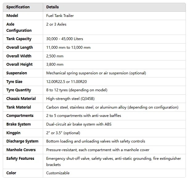 The Fuel Tank Trailer is a specialized transport solution designed for the safe and efficient movement of fuel, including gasoline, diesel, and other flammable liquids. Available in 2-axle or 3-axle configurations, with tank capacities ranging from 30,000 to 45,000 liters, this trailer is ideal for industries requiring reliable and secure fuel transportation.
