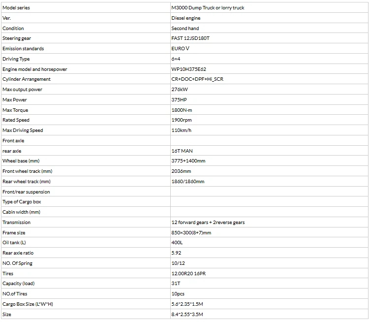 The SHACMAN M3000 6x4 Dump Truck is a powerful, reliable vehicle designed to meet the needs of industries that require tough and efficient transportation. Known for its robust build and high-performance capabilities, this truck is an ideal choice for businesses dealing with heavy-duty tasks like construction and mining. It offers a perfect balance of strength, durability, and functionality, ensuring long-term reliability for its owners.
