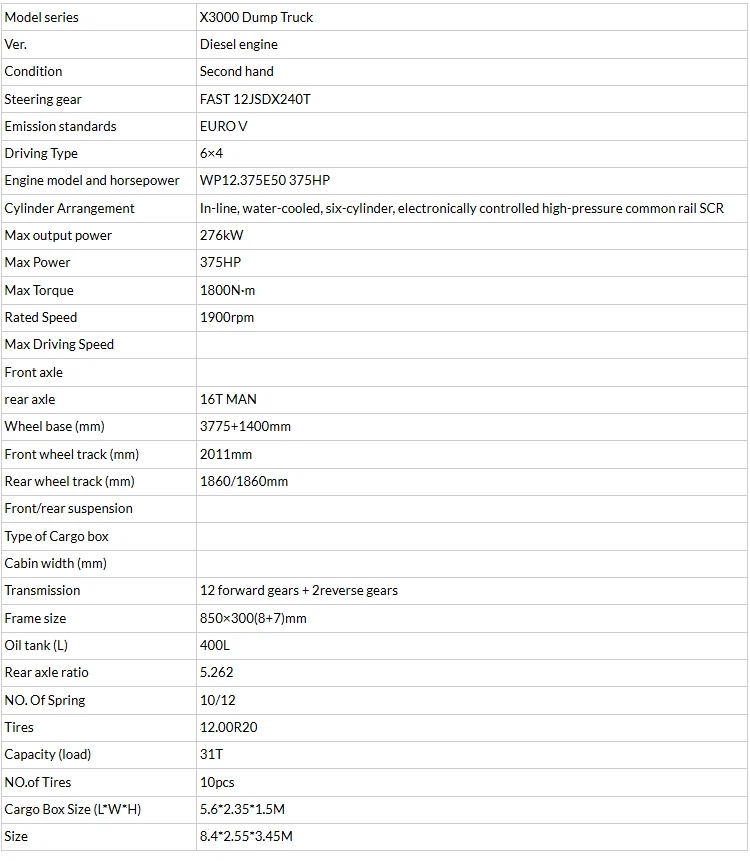 The SHACMAN X3000 6x4 Dump Truck brings the same level of quality as European and American trucks, setting a new standard for high-end logistics transportation. Known for its outstanding fuel economy, reliability, intelligence, safety, and comfort, this vehicle is fully equipped to meet the...
