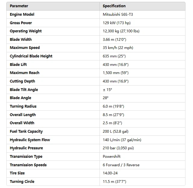 Mitsubishi 430 Grader is a dependable and high-performing machine, purpose-built to handle diverse grading and earthmoving tasks. Powered by the efficient Mitsubishi S6S-T3 engine, it generates 129 kW (173 hp) of gross power, ensuring smooth and reliable operation in road construction, maintenance, and other demanding projects. With an operating weight of 12,300 kg (27,100 lbs), the 430 Grader balances stability and maneuverability across different terrains.