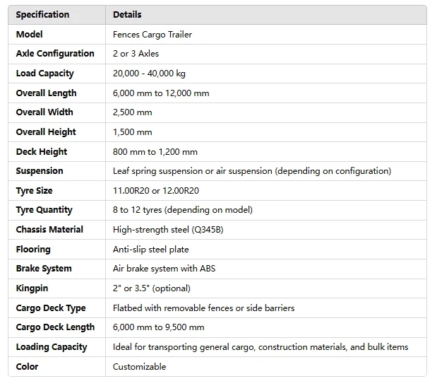 Built with a high-strength steel chassis (Q345B) and anti-slip steel plate flooring, the Fences Cargo Trailer offers durability and security for all types of cargo. Its flatbed design, complete with removable fences or side barriers, allows for flexibility in handling different types of loads. The customizable kingpin size (2" or 3.5") ensures compatibility with various towing vehicles.